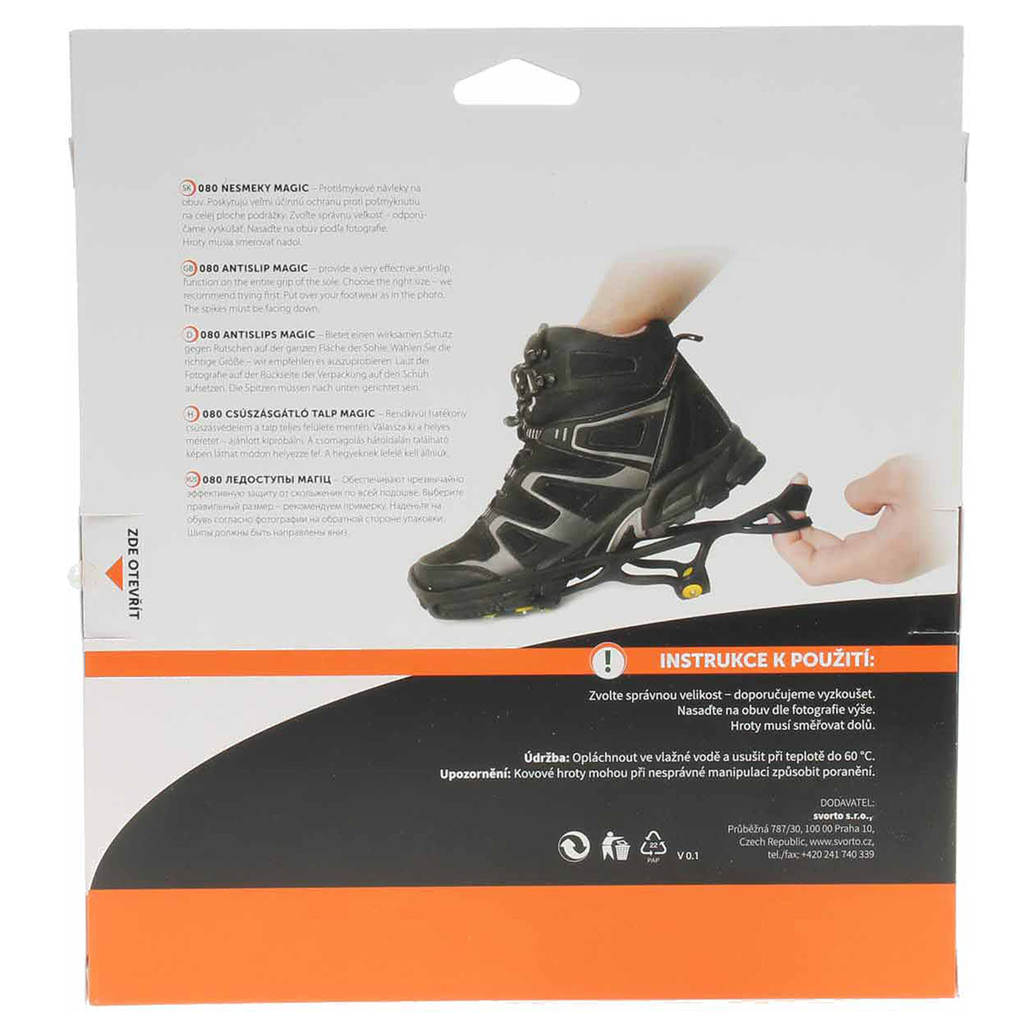 Svorto Nesmeky MAGIC - protismykový návlek na obuv je jednoduchá a snadno aplikovatelná pomůcka pro malé dětí až po lidi vysokého věku. Je vhodný na procházky ale i na pracovní použití. Udané velikosti jsou pouze orientační, vždy záleží na konkrétním typu obuvi - M = 36-39, L = 40-43, XL = 44-47.