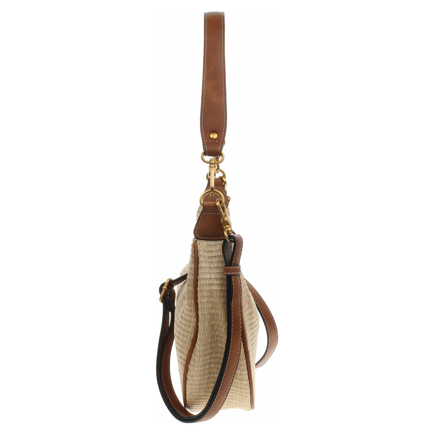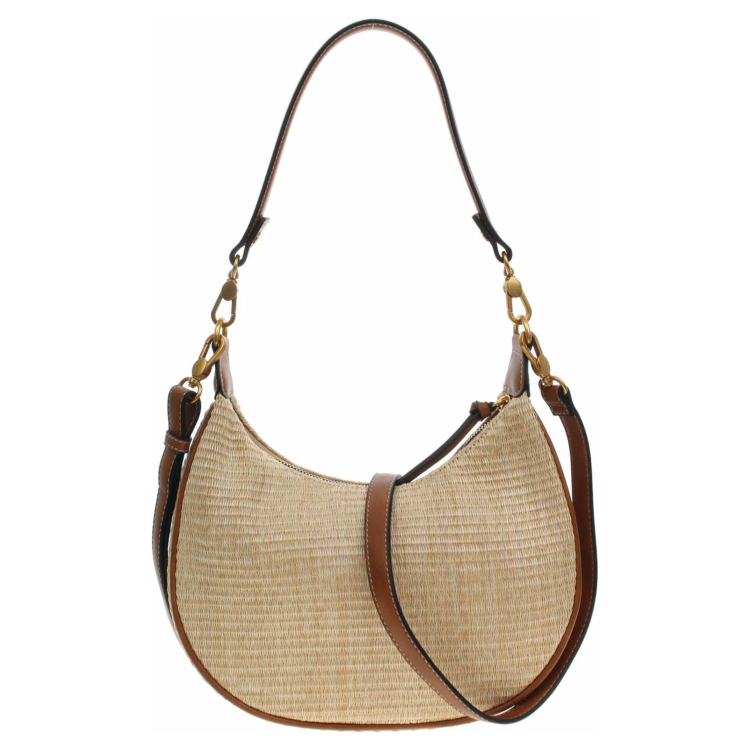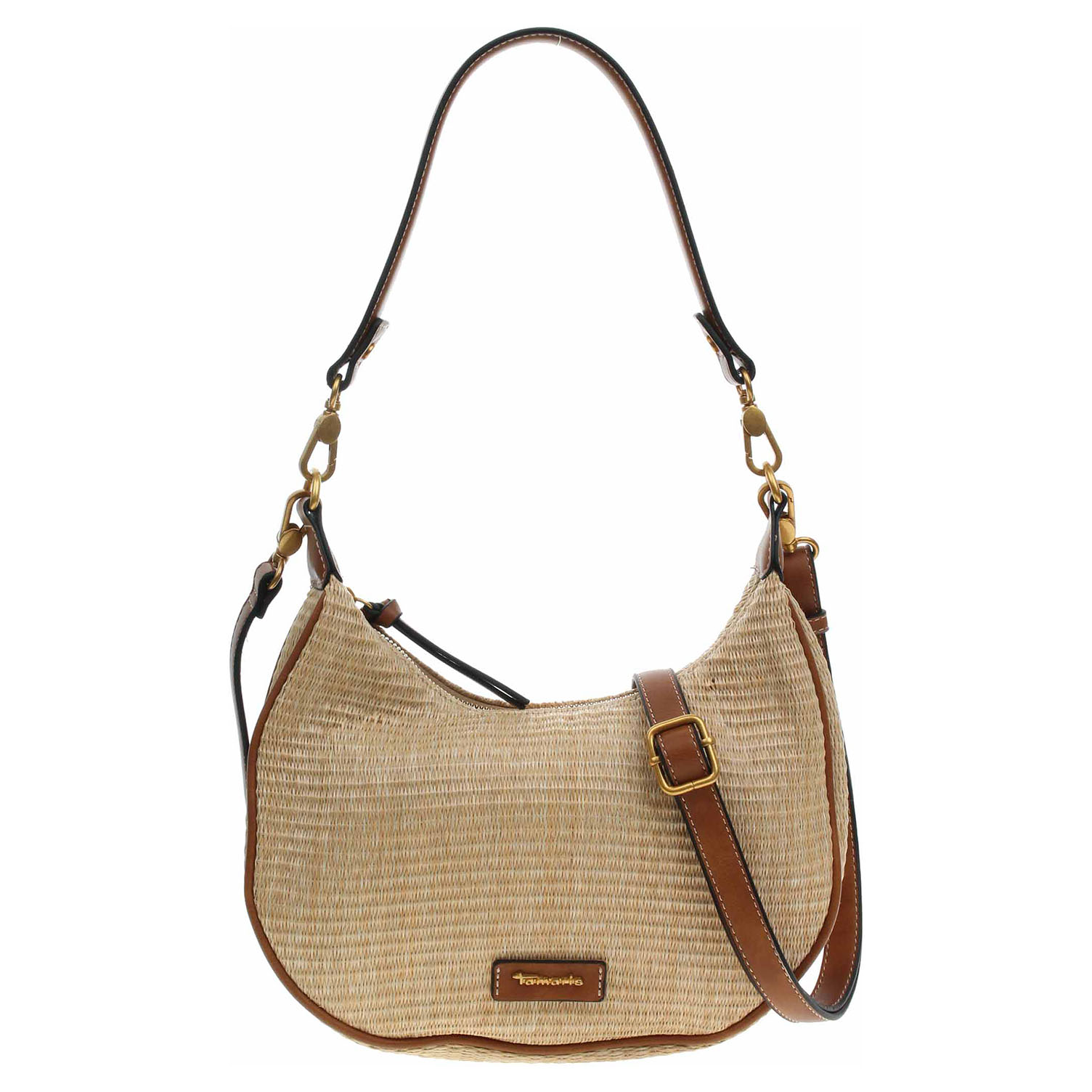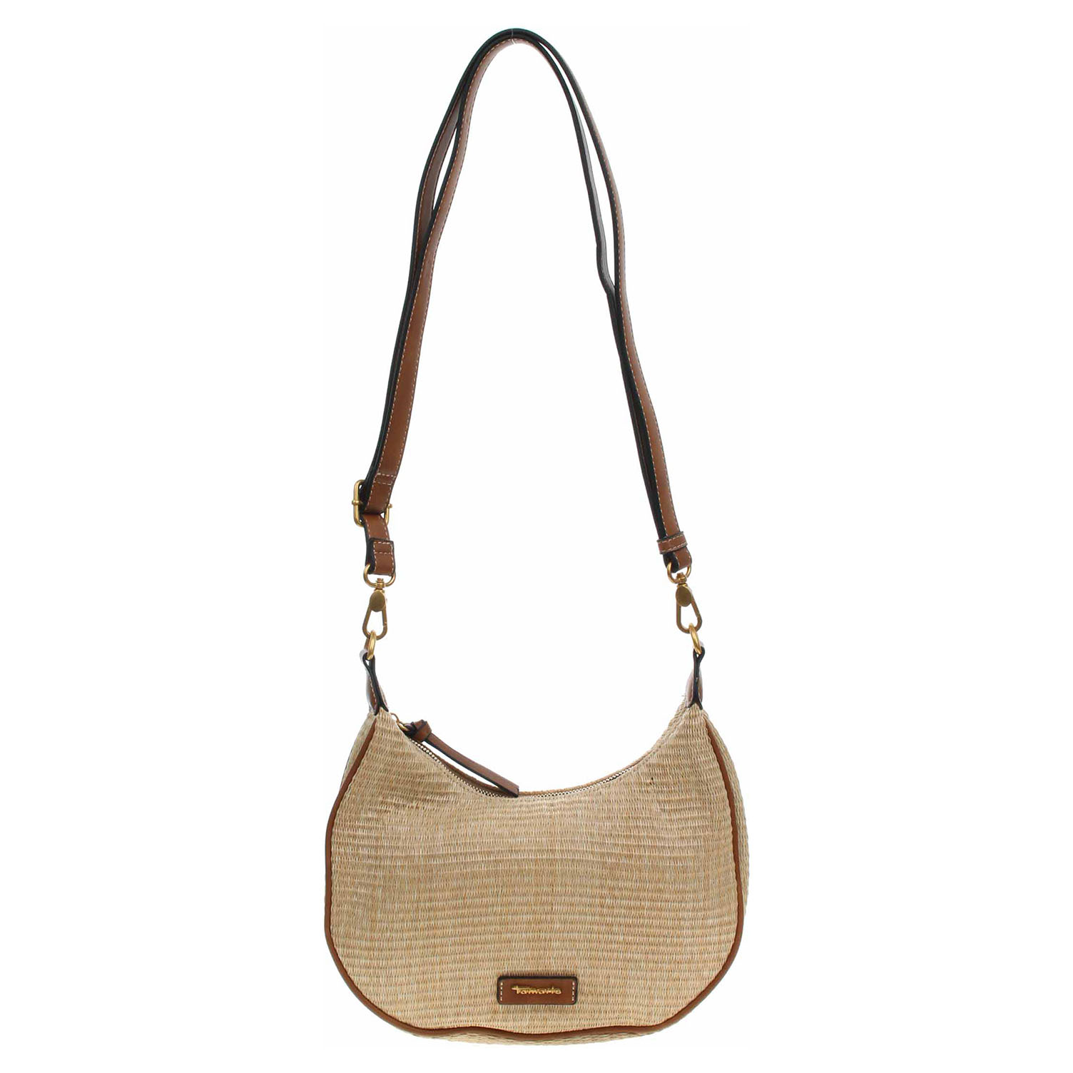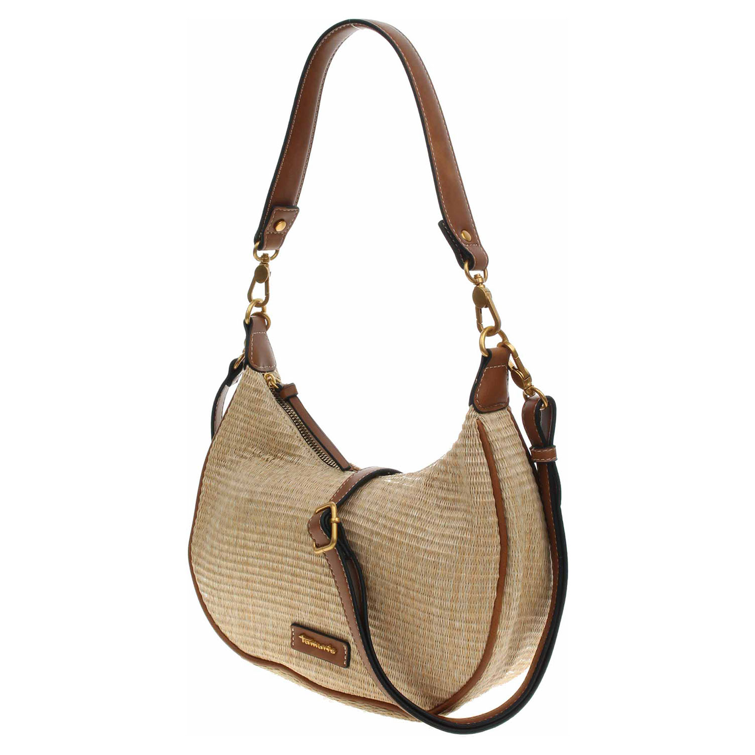 Popis:Tamaris - dámská kabelka se zapínáním na zip má svršek kombinovaný polyethylen/polypropylen (80% / 20%) a podšívka je z polyesteru. Kabelku je možno nosit v ruce za odepínatelný kratší popruh (výška 29 cm) nebo po výměně přes rameno na regulovatelném popruhu s karabinkami (délka cca 140,- cm). Rozměry: 27 x 8 x 26 cm. Karabinky, kroužky, zip i logo jsou z leštěného kovu zlaté barvy. Vnitřní výbava: 1x kapsa se zipem a 1x kapsa bez zapínání.