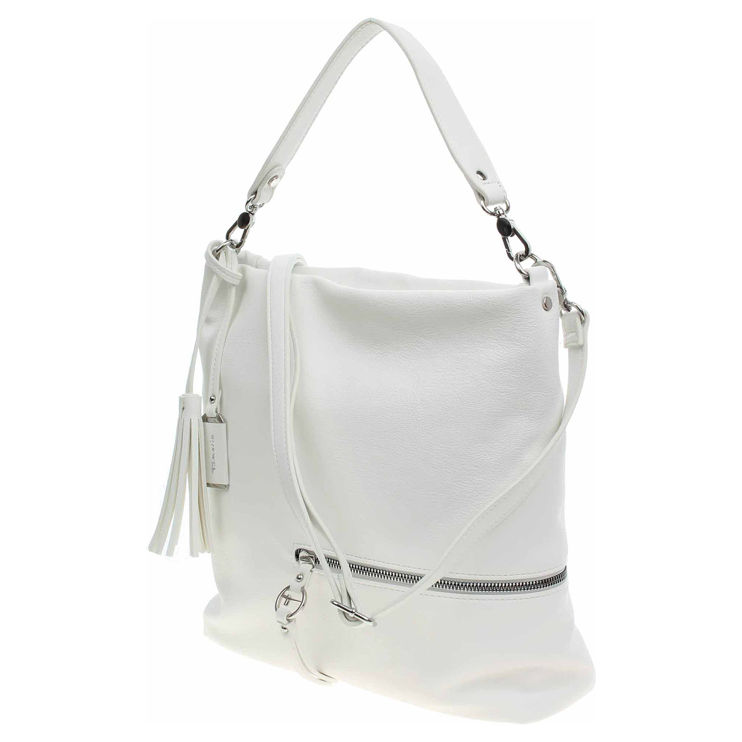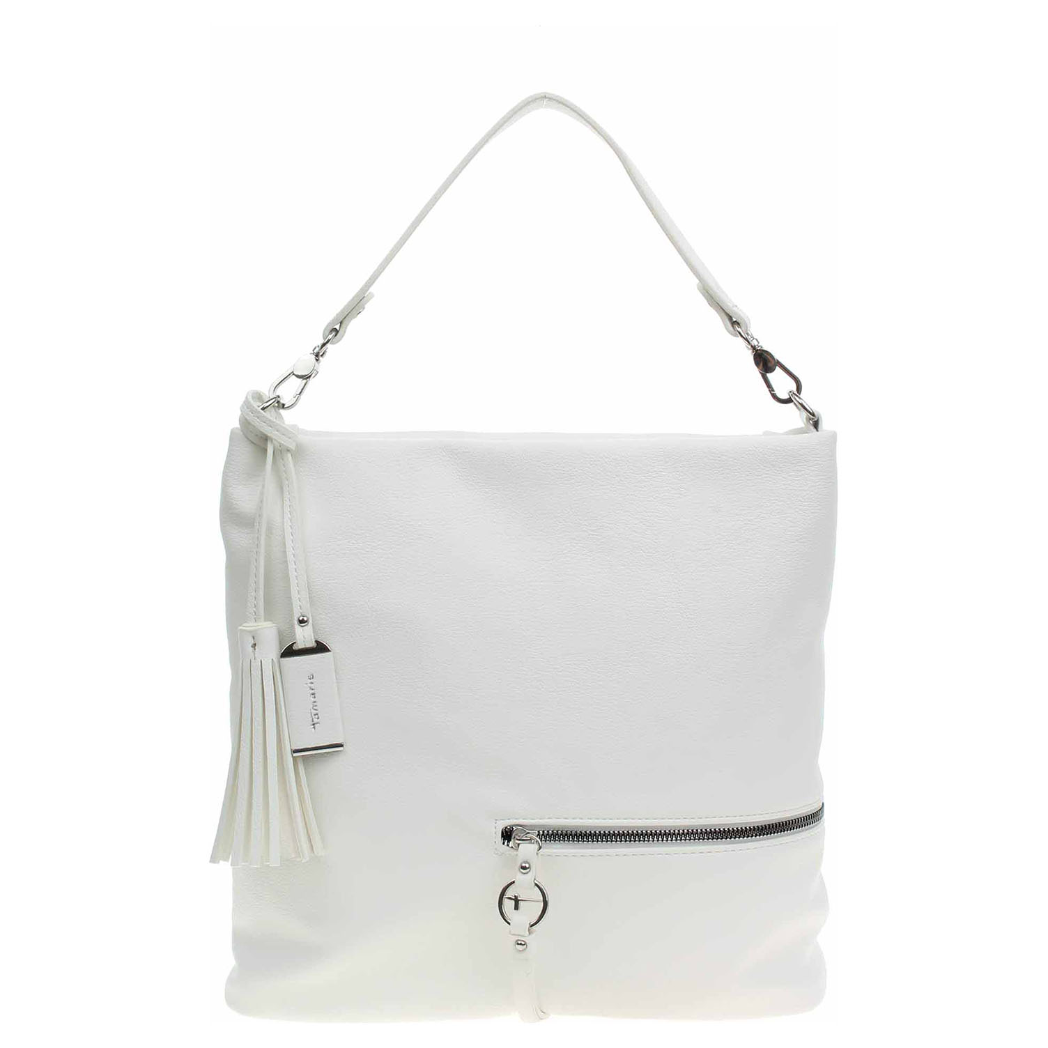 Tamaris - dámská kabelka se zapínáním na zip má svršek z polyuretanu a podšívku z polyesteru. Na přední i na zadní straně kabelky je kapsa se zipem. Kabelku je možno nosit v ruce za kratší, odepínatelný popruh s karabinkami (výška 15 cm) nebo přes rameno na regulovatelném popruhu (140 cm), který se dá odepnout. Rozměry: 37 x 14 x 33 cm. Kroužky, zipy i logo jsou z leštěného kovu stříbrné barvy. Vnitřní výbava: 1x kapsa se zipem a 1x kapsa bez zapínání.