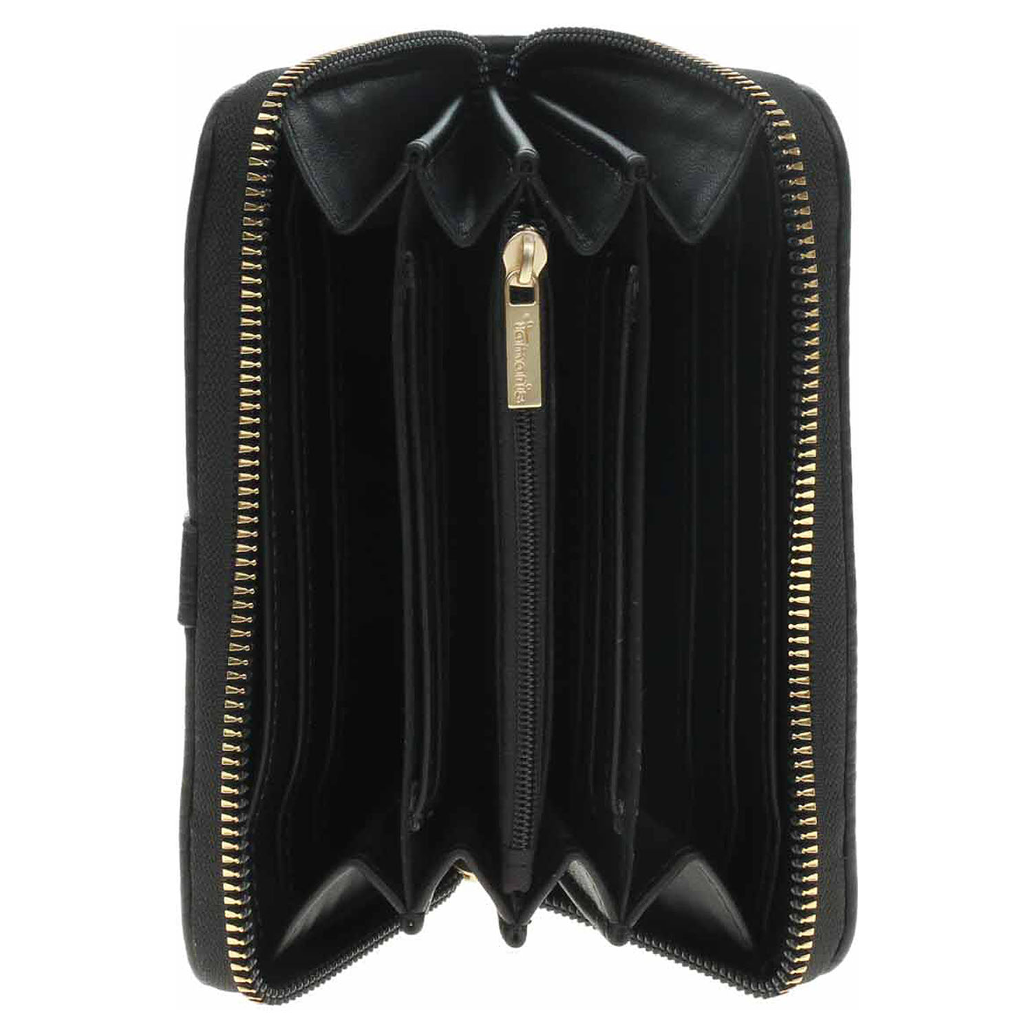 Tamaris - dámská peněženka se zlatými detaily je vyrobená ze 100% polyuretanu a s podšívkou ze 100% polyesteru. Zapíná se na zip. Vnitřní výbava: přihrádky na bankovky a na karty a kapsička na mince, která se zapíná na zip. Rozměry - 15,5 x 10 x 3,5 cm.