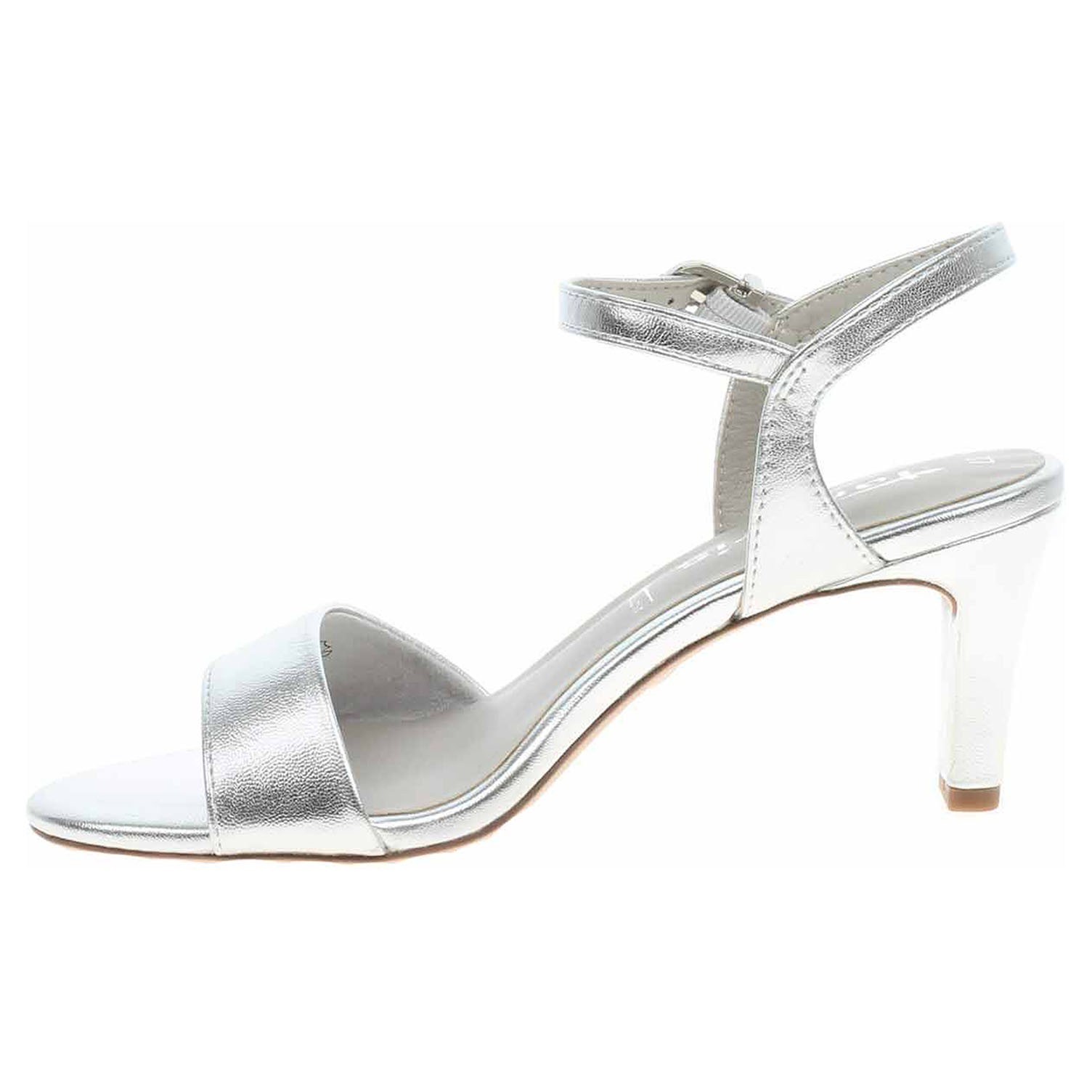 Boty Tamaris - společenské dámské sandály se svrškem ze syntetiky jsou vybavené paměťovou stélkou Touch it. Podšívka je kombinovaná textil/syntetika. Vyměkčená stélka se přizpůsobuje vašemu chodidlu a zajišťuje při chůzi optimální komfort. Pásek přes nárt se všitou gumičkou se zapíná na přezku a poskytuje tak možnost délkové regulace. Podpatek je vysoký 7,5 cm. VEGAN SHOES - obuv je 100% VEGAN = při výrobě obuvi nebyly použity žádné materiály ze zvířat. Společenská obuv - vhodná ke krátkodobému nošení v interiérech. Obuv nevystavujte vlhkosti.