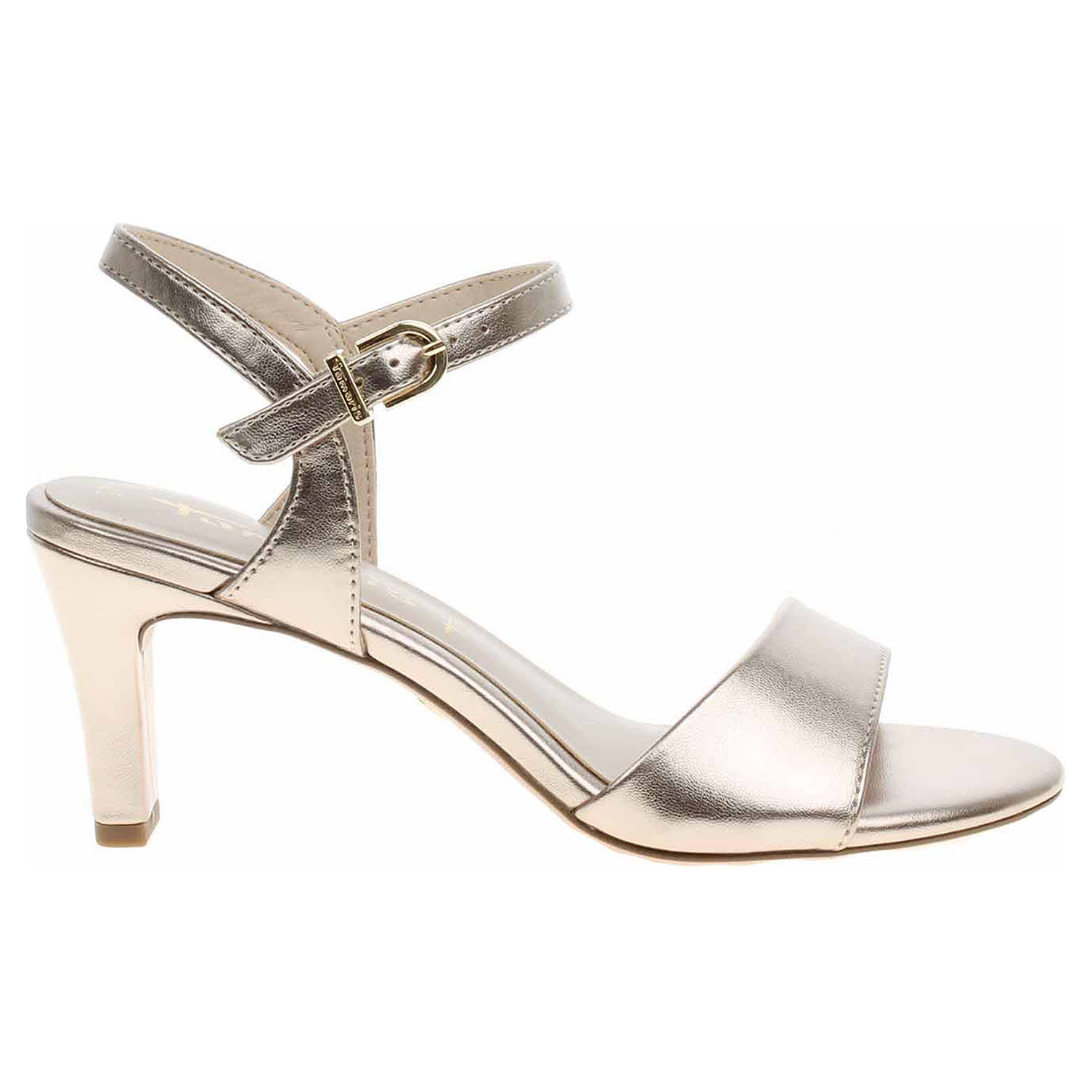 Boty Tamaris - společenské dámské sandály se svrškem ze syntetiky jsou vybavené paměťovou stélkou Touch it. Podšívka je kombinovaná textil/syntetika. Vyměkčená stélka se přizpůsobuje vašemu chodidlu a zajišťuje při chůzi optimální komfort. Pásek přes nárt se všitou gumičkou se zapíná na přezku a poskytuje tak možnost délkové regulace. Podpatek je vysoký 7,5 cm. VEGAN SHOES - obuv je 100% VEGAN = při výrobě obuvi nebyly použity žádné materiály ze zvířat. Společenská obuv - vhodná ke krátkodobému nošení v interiérech. Obuv nevystavujte vlhkosti.